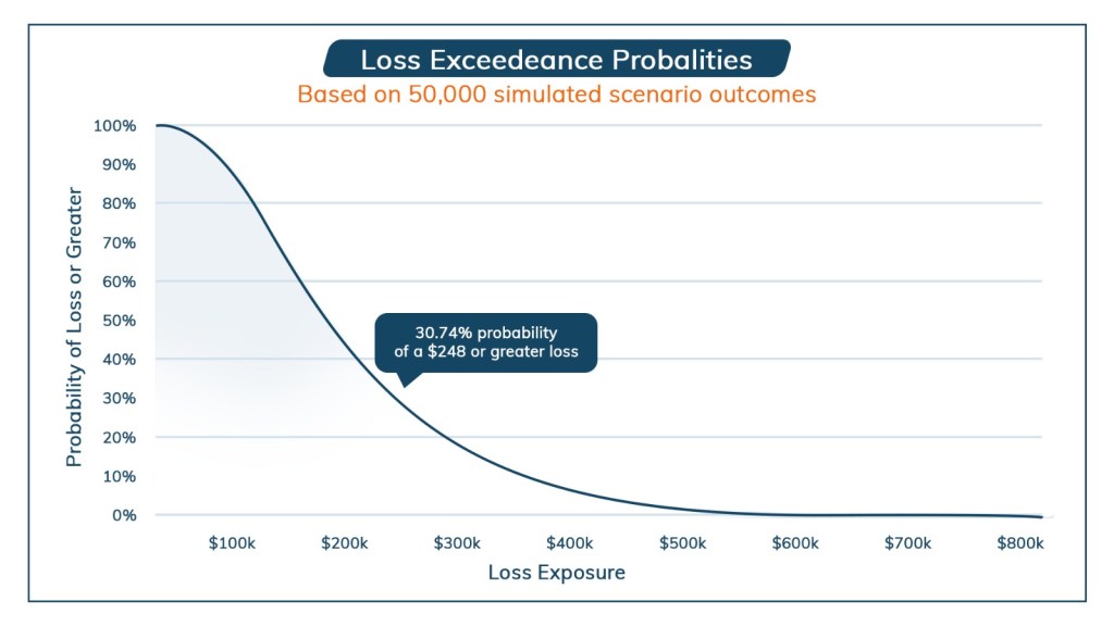 The value at risk (VaR) or anticipated loss from risk exposure is typically estimated using advanced modeling approaches like Monte Carlo simulations. Here is an illustration below: